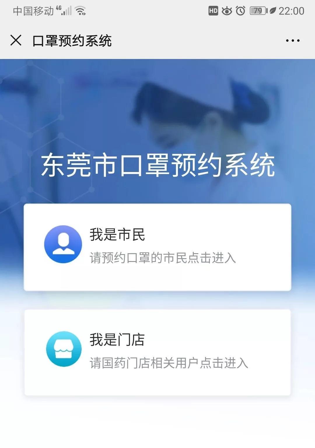 登录“东莞市口罩预约系统”后点击“我是市民”按钮。