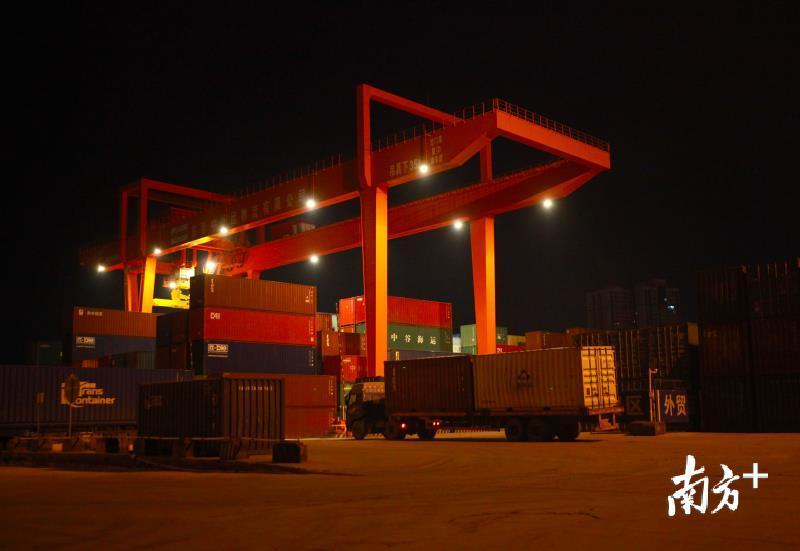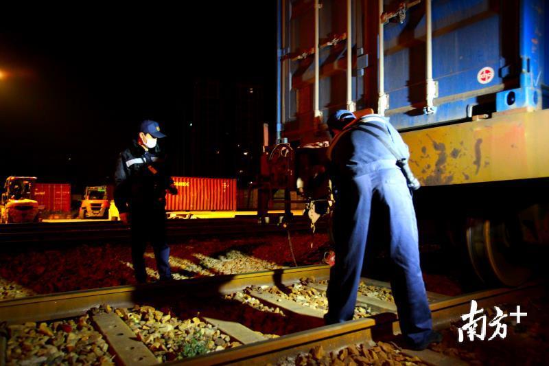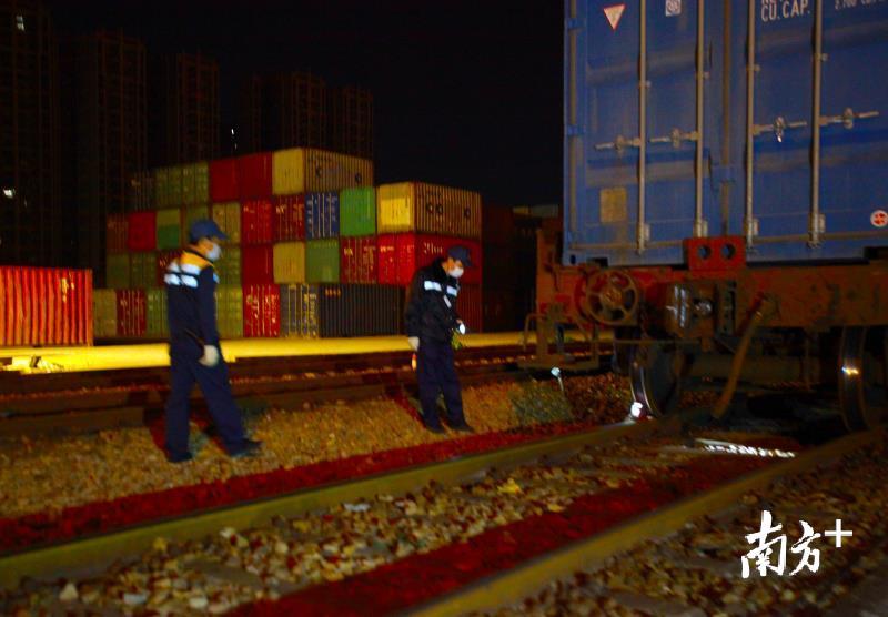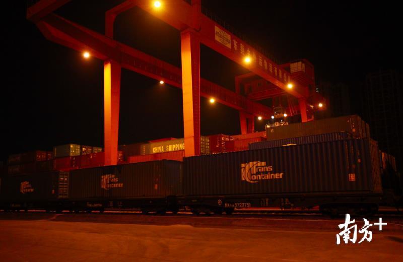 凌晨1点多,当周围一片寂静时,广东(石龙)铁路国际物流基地已是一片繁忙的景象。工作人员将货柜装到火车上,通宵作业。凌晨3点多,中欧班列完成装货并开始发运前的各项准备工作。