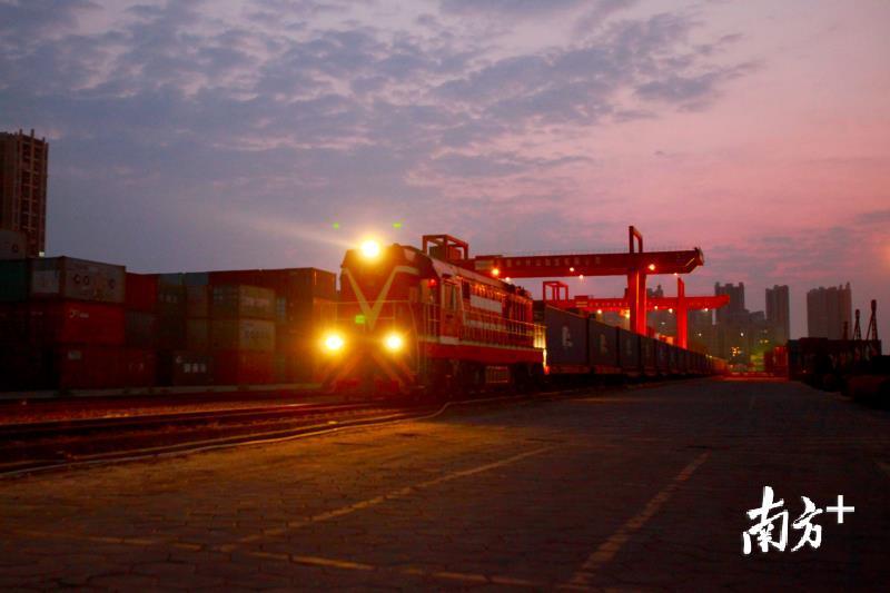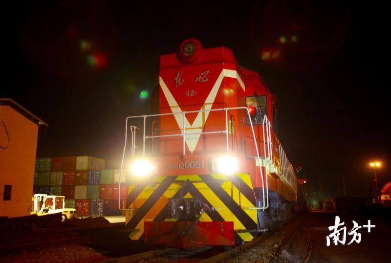 早上6:00,火车头缓缓驶来,短短十几秒就完成了与车厢的对接;半个小时后,伴随着一声长笛响起,火车头牵引着42节车厢,从广东(石龙)铁路国际物流基地缓缓驶出。