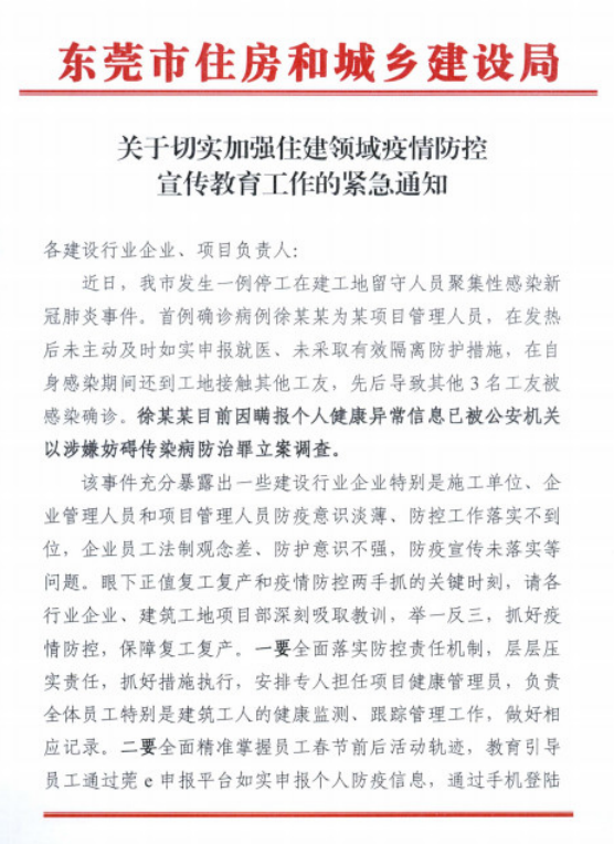 眼下正值复工复产和疫情防控两手抓的关键时刻,东莞市住建局呼吁各行业企业、建筑工地项目部深刻吸取教训,举一反三,抓好疫情防控,保障复工复产。