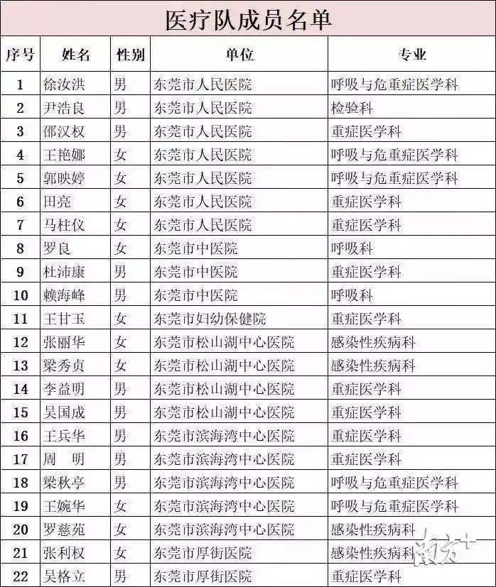 东莞市第一批支援湖北疫情防控医疗队成员名单: