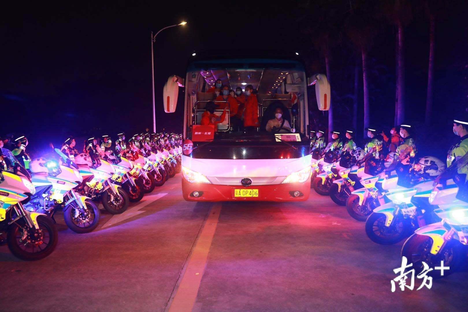 终于盼到英雄归乡。3月20日下午,高铁专列抵达广州南站后,队员们乘坐回莞大巴,回莞路上,东莞市交警支队的警车列队迎接,一台警车三辆铁骑全程带路,为载誉而归的援鄂战疫英雄们保驾护航。