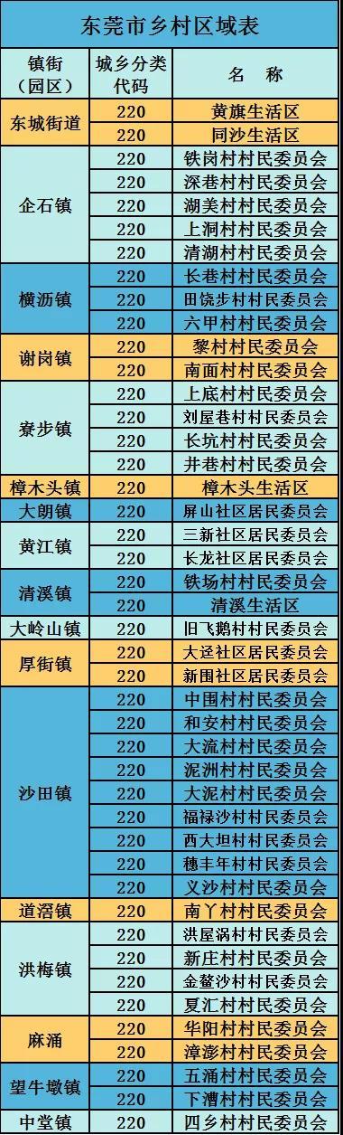 国家统计局网站《关于更新全国统计用区划代码和城乡划分代码的公告》中,东莞市乡村区域表如下: