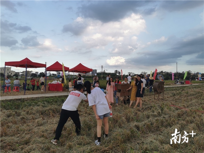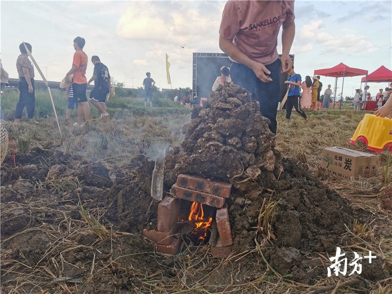 8月8日,东莞发布高温预警,午后的阳光依旧炙热。但在常平镇横江厦锅田里却热闹非凡,大人与小孩或收割水稻,或下田摸鱼、种红薯、扎稻草人,甚至就地取材,在田里垒起了农家土窑。