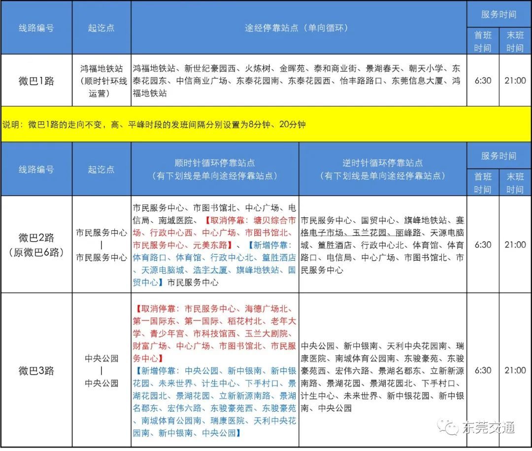 根据《东莞市中心城区公交线网优化调整方案》,为优化调整鸿福片和西平片微循环公交线路,提升微巴车辆使用效率,方便市民出行,现作出以下调整: