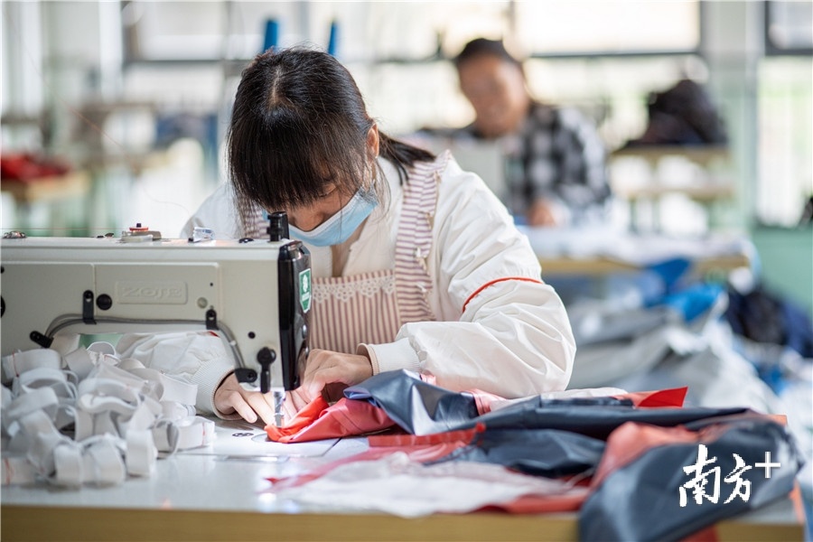 扶贫车间里,两个小孩在玩耍,他们的母亲文泽寻正在缝纫机上忙碌。文泽寻说,扶贫车间相对自由,她可以接送小孩上学,晚上还能到车间加夜班。