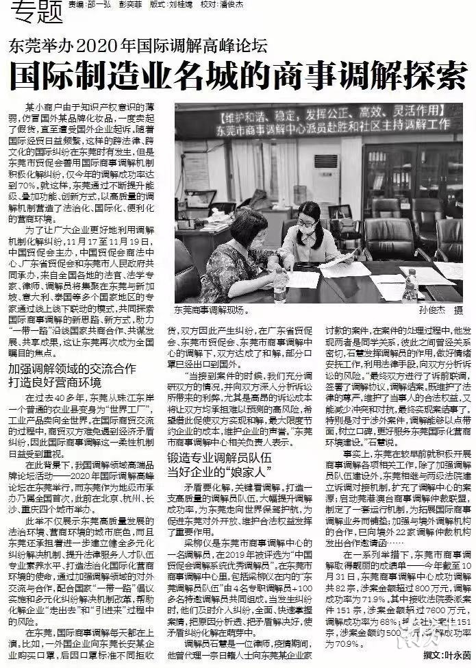 在过去40多年,东莞从珠江东岸一个普通的农业县变身为“世界工厂”,工业产品卖向全世界。在国际商贸交流的过程中,商贸双方难免遇到经济矛盾纠纷,因此国际商事调解这一柔性机制日益受到重视。