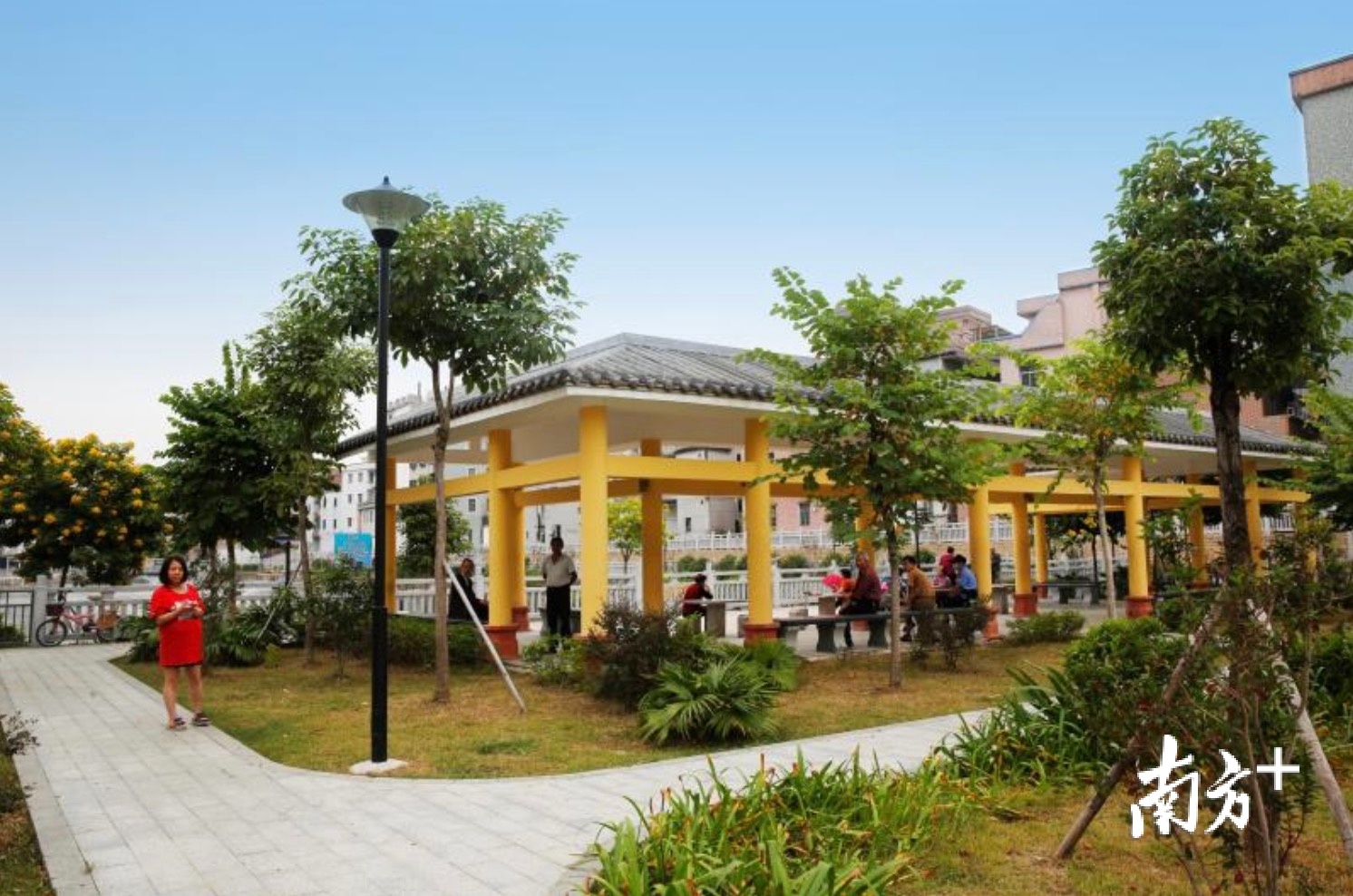 公园内,老人悠闲地坐在树下,小孩骑着车一边玩耍……阳光正好,微风拂面,石碣镇涌口村的群众倍感惬意。