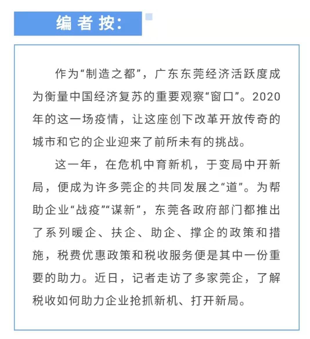 2020年以来,由于新冠肺炎疫情等因素影响,全球贸易活动大受冲击,作为以外贸大市闻名全球的东莞,影响更是首当其冲。对于东莞外贸企业来说,如何扛住挑战、跨过难坎、谋求出路……这一切不仅仅关乎企业的复产发展,也成为东莞政府部门的一场“考试”。为了“稳外贸”,东莞相关部门纷纷出台一系列政策和措施暖企助企撑企,其中,税务部门也在“稳外贸”推出了许多实招。