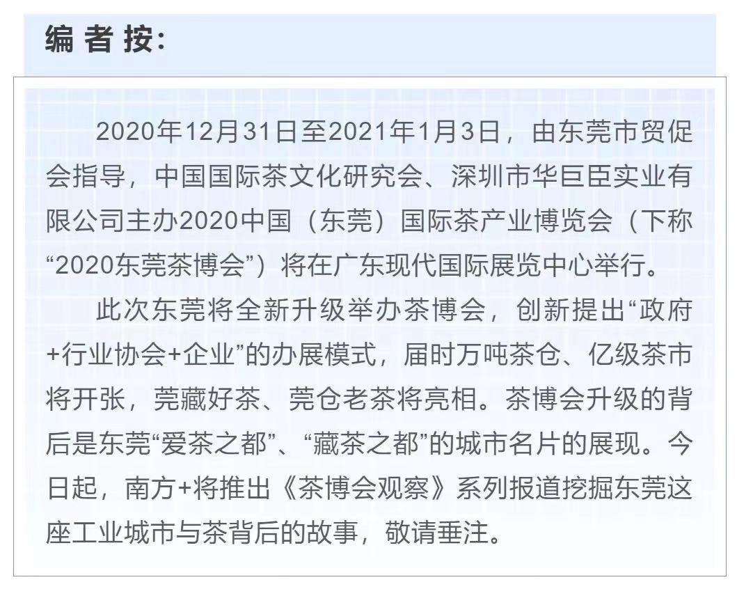 2020年12月31日至2021年1月3日,由东莞市贸促会指导,中国国际茶文化研究会、深圳市华巨臣实业有限公司主办2020中国(东莞)国际茶产业博览会(下称“2020东莞茶博会”)在广东现代国际展览中心举行。此次东莞全新升级举办茶博会,创新提出“政府+行业协会+企业”的办展模式,万吨茶仓、亿级茶市开张,莞藏好茶、莞仓老茶亮相,吸引了来自全国69个名茶产区的600家龙头品牌前来喝茶、交流。