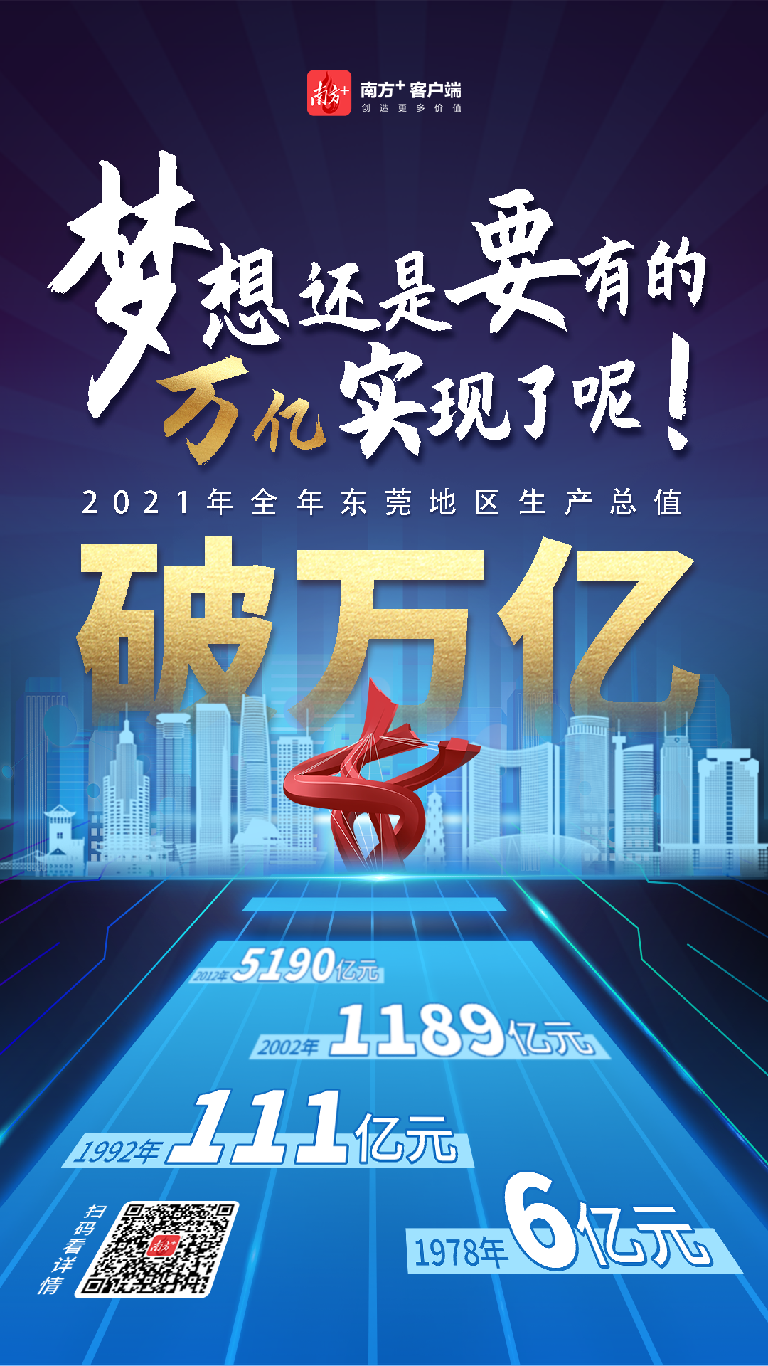 1月20日,广东省政府工作报告明确,东莞GDP过万亿,成为广东继广州、深圳、佛山之后第4座GDP超万亿的城市,也成为全国第15个GDP过万亿、人口超千万的“双万城市”。