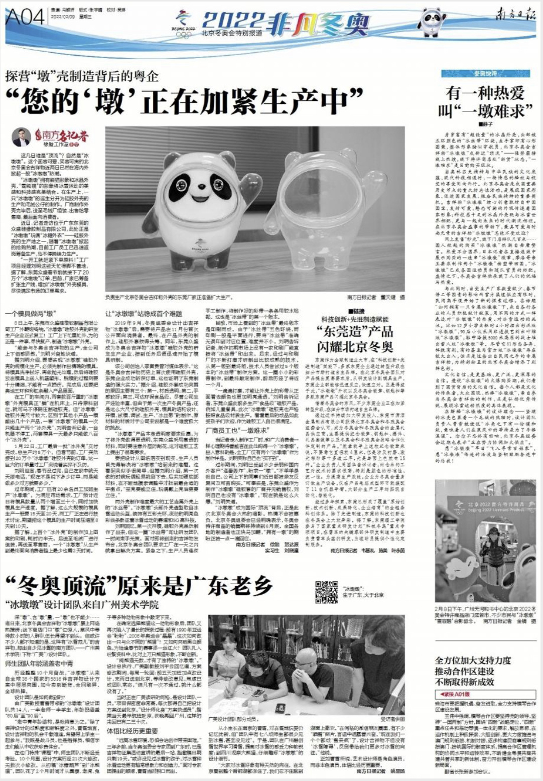 东莞作为全球制造业大市,在“科技创新+先进制造”赋能下,多家东莞企业通过转型升级在细分市场打造自主品牌。在北京冬奥会团队对产品提出更高要求后,从研发设计到模具生产,东莞企业都能够迅速反应,快速应对。正是得益于此,“冰墩墩”外衣以及冬奥会徽章、钥匙扣等多款东莞产品闪耀北京冬奥会。