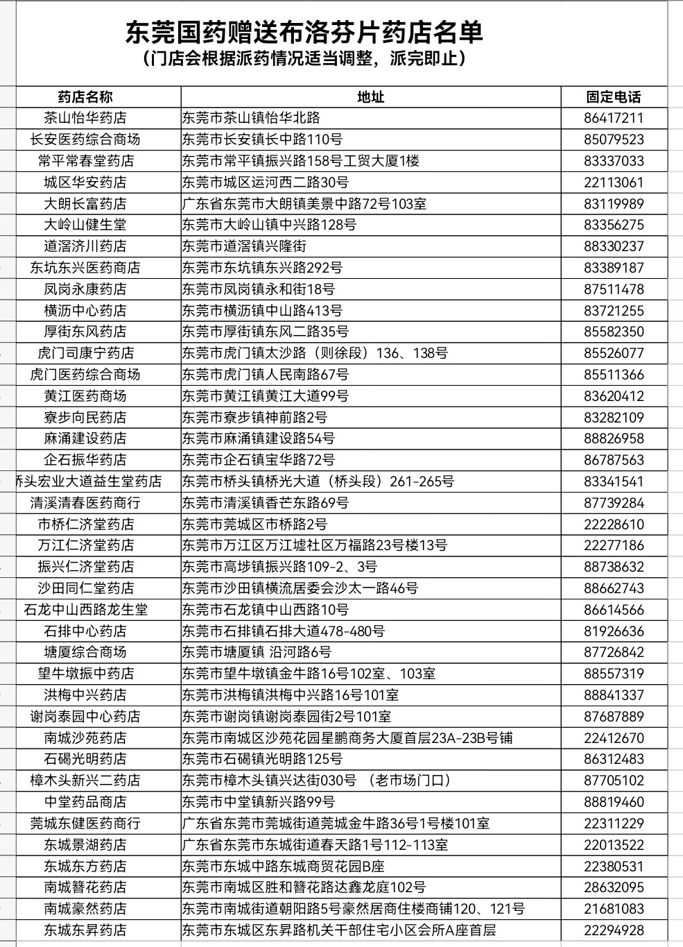 东莞国药集团办公室副主任赖宇宁介绍:首批到货的10万片布洛芬目前全部在加班分包过程中。公司计划将通过全市41家门店进行全部派送(具体派送门店、地址和时间详见下表),每个镇街至少会选取1家门店作为派送点,考虑到城区人口密度高,则适当增加了该区域的部分派送门店数。统一安排自12月22日早晨8点开始派送,6粒一份,市民可凭身份证到相应门店免费领取,每人限领取1份,因这次到货数量有限,采取赠药的方式,先到先领,赠完即止。