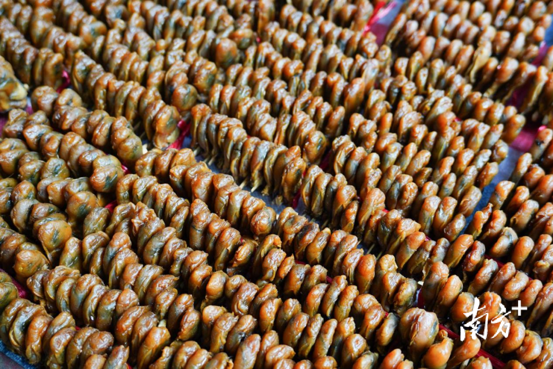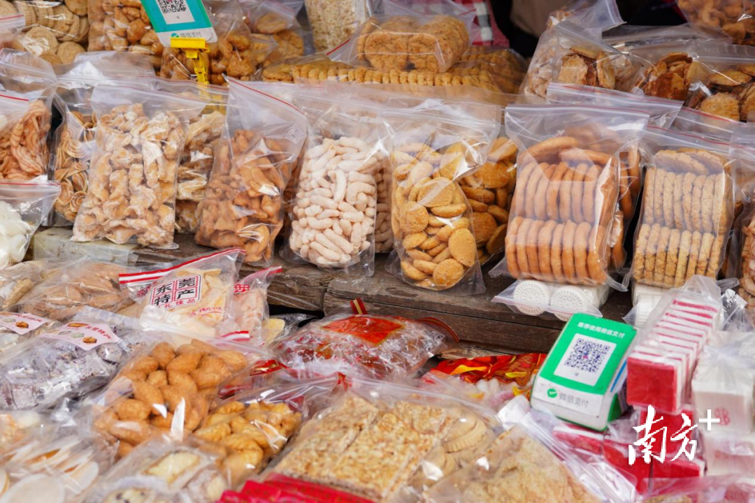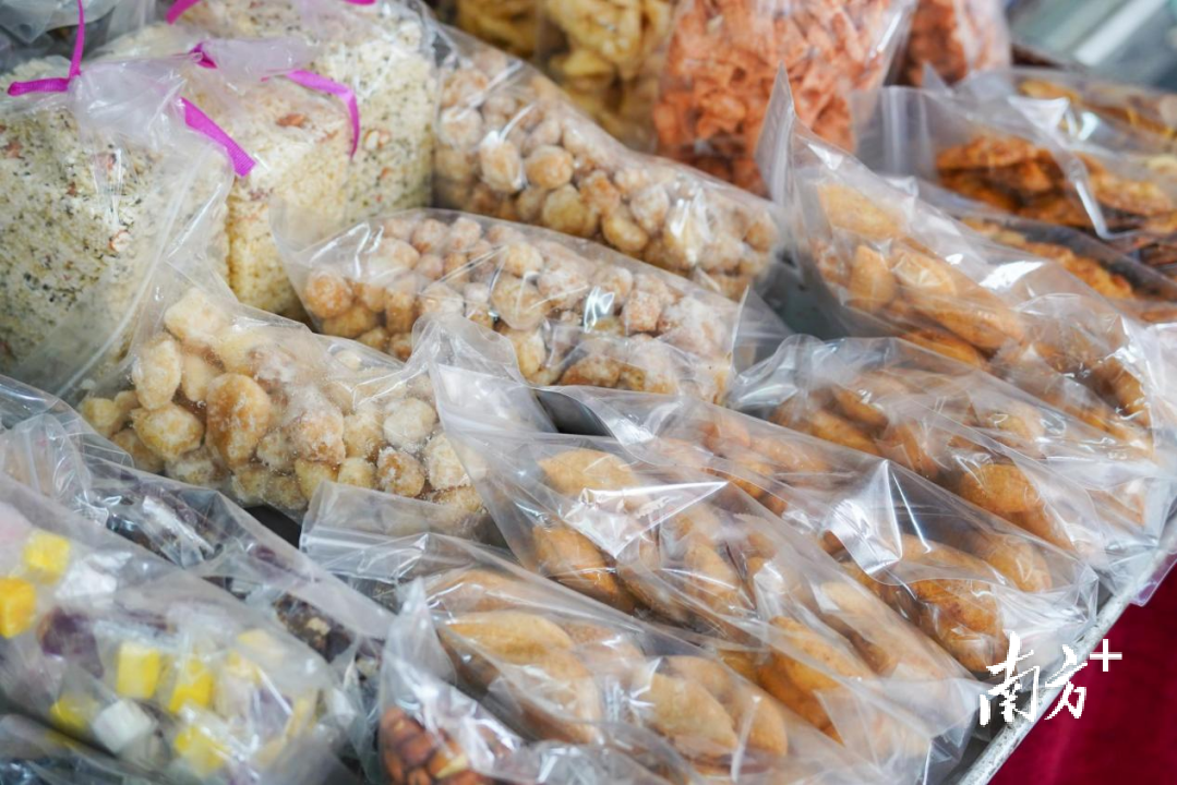 街边摆卖的年货美食——糖冬瓜、糖莲子、油角、糖环等,都是“老东莞”过年必吃的美味零食。