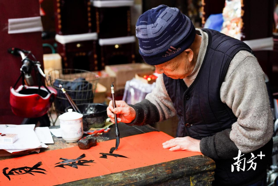 1931年出生的周容爷爷写了几十年对联。住在东城的莫先生专程从东城来到莞城买了两幅手写对联,“我小的时候爸爸就来这里买对联,所以我们年年都来这里买!”