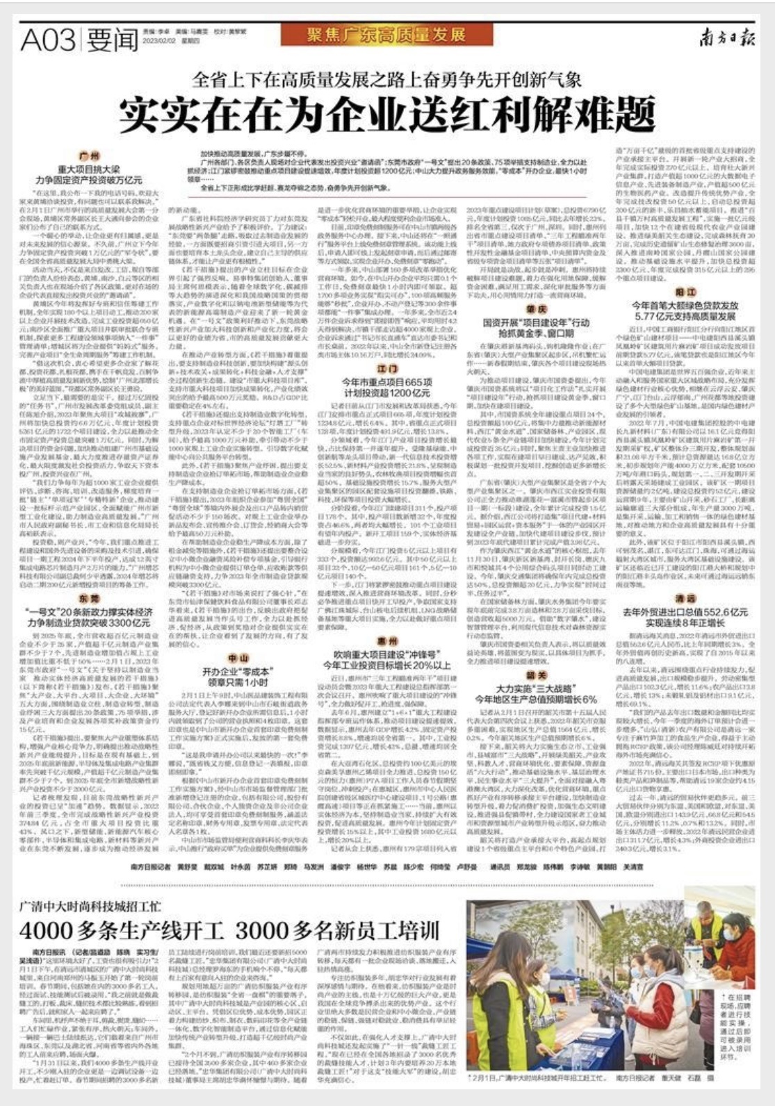 《若干措施》提出的产业立柱目标在企业界引起了强烈反响。易事特集团创始人、董事局主席何思模表示,随着全球数字化、碳减排等大趋势的演进深化和我国战略国策的贯彻落实,产业数字化和以钠电池新型储能等为代表的新能源高端制造产业迎来了新一轮黄金机遇。在“一号文”政策利好推动下,东莞战略性新兴产业加大科技创新和产业化力度,将会以更好的业绩为省、市的高质量发展贡献更大力量。