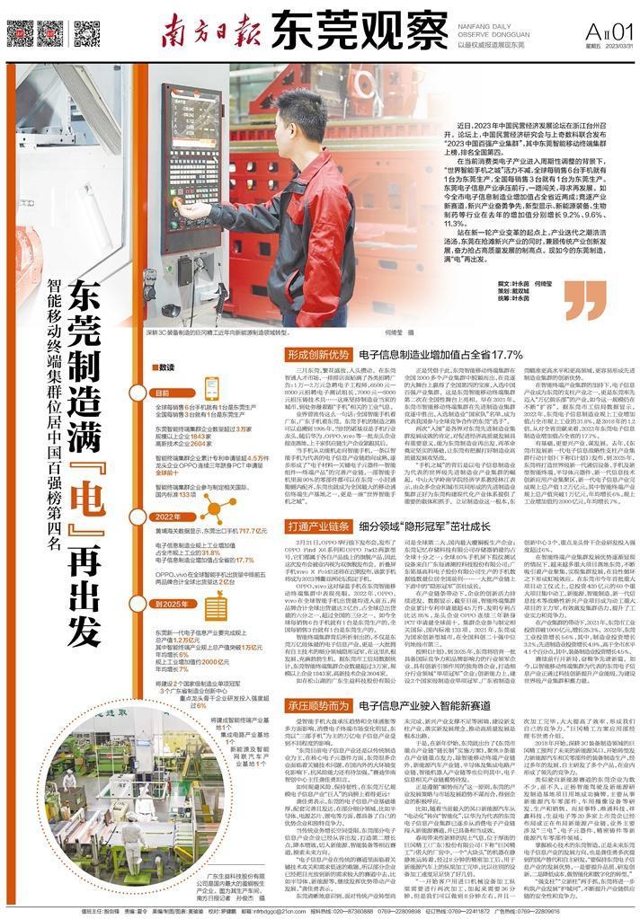 “手机之城”的背后是以电子信息制造业为代表的世界级先进制造业产业集群的崛起。中山大学岭南学院经济学系教授林江表示,由众多企业和城市共同形成的先进制造业集群正好为东莞构建现代化产业体系提供了重要的载体和抓手。立足制造业这一根本,东莞瞄准更高水平和更高领域,更容易形成先进制造业集群的创新优势。