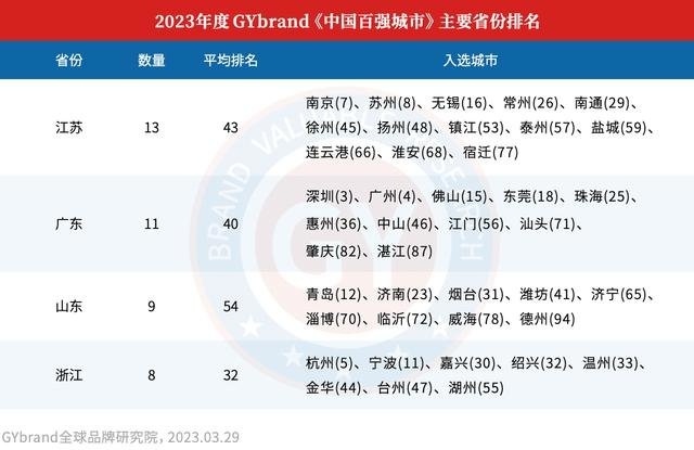 榜单显示,2023中国百强城市分布于29个省份地区,江苏、广东、山东、浙江四大强省入选城市总数占比达到41%。其中,广东有11个城市入选,东莞占了一席。
