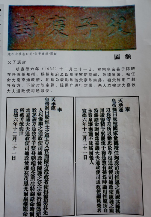 小编在陈仲仪编著的《桥头历史名人》一书里看到对“父子褒封”的由来也有记载:“明宣德六年(1432年)十二月二十一日,宣宗皇帝鉴于陈琏在任滁州知州、扬州知府及四川按察使期间,政绩显著,被任命为南京通政使。朝廷为表彰陈琏的父亲陈宗彝、祖父陈用广教导有方,下旨对陈宗彝、陈用广进行封赏。”书中还附有明廷对陈琏父亲和祖父进行封赏的圣旨,两个圣旨的时间都是同一天:宣德六年十二月二十一日。