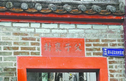 在厚街桥头社区北社村的一处古巷巷口,则立着一个青砖灰瓦朱门的牌坊,牌坊1米多宽,两米多高。从右到左写着“父子褒封”四个字。