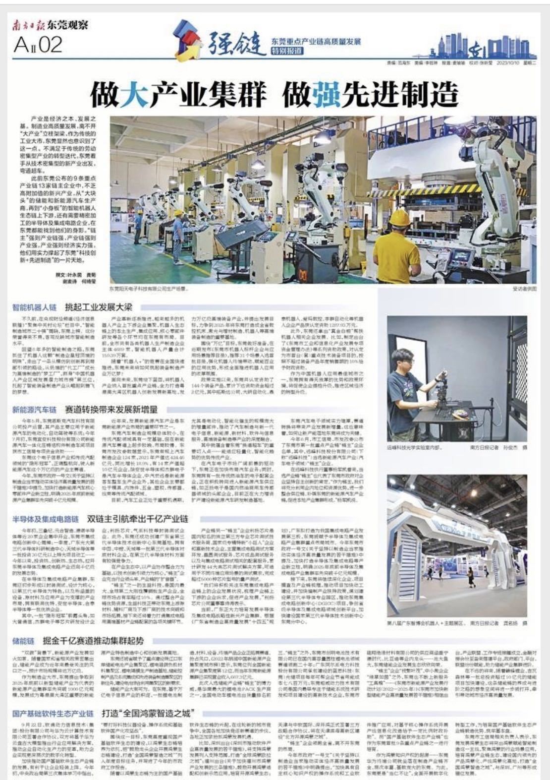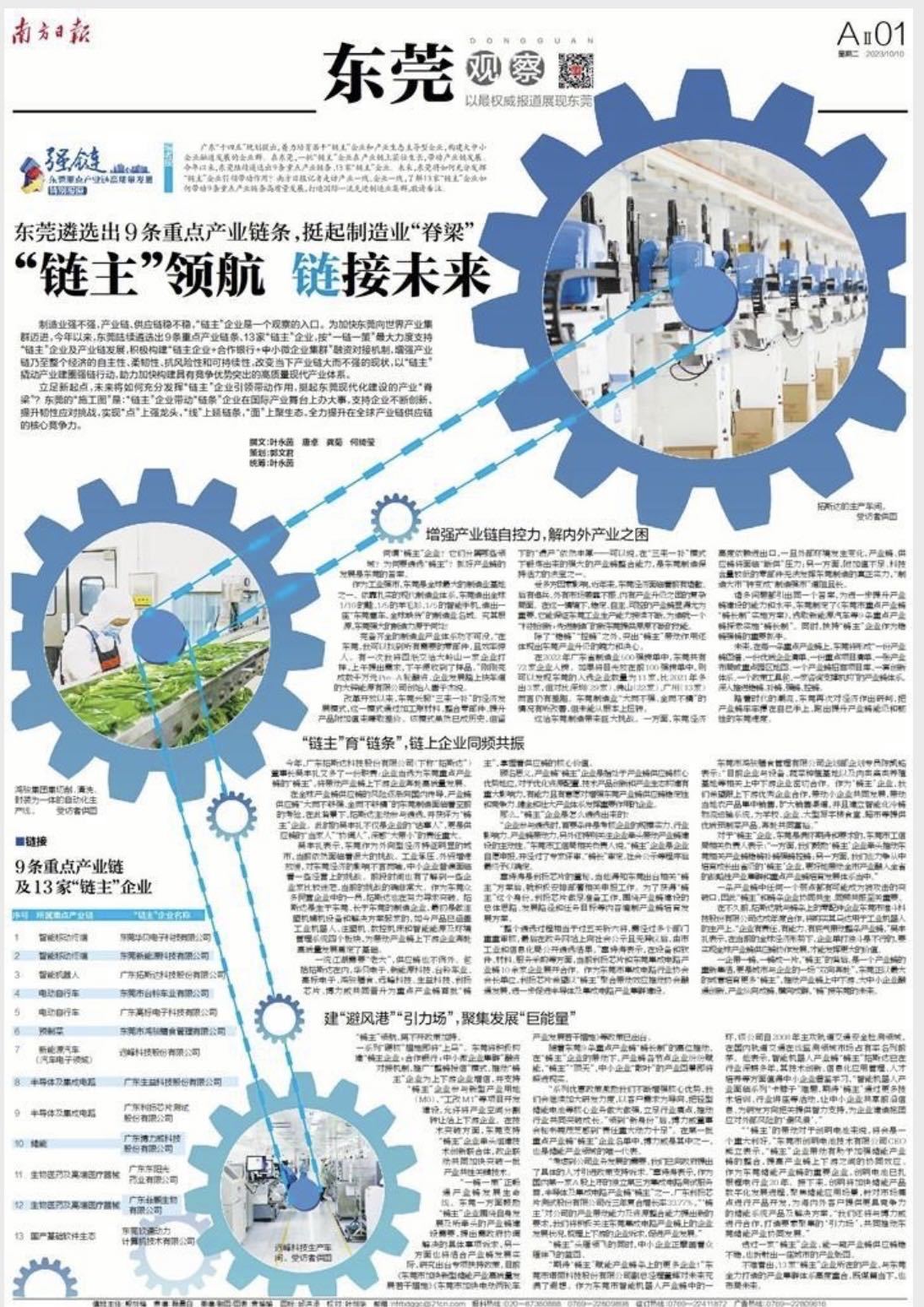 广东“十四五”规划提出,着力培育若干“链主”企业和产业生态主导型企业,构建大中小企业融通发展的企业群。在东莞,一批“链主”企业在产业链上茁壮生长,带动产业链发展。今年以来,东莞陆续遴选出9条重点产业链条、13家“链主”企业。未来,东莞将如何充分发挥“链主”企业引领带动作用?今日,南方日报推出三个半版,聚焦东莞13家“链主”企业如何带动9条重点产业链条高质量发展,打造国际一流先进制造业集群。