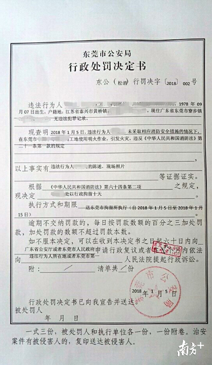 东莞市公安局消防支队表示,依据《中华人民共和国消防法》第六十四条第一款第一项、第六十四条第一款第二项之规定,松山湖消防大队依法对违法行为人李某和黄某分别做出行政拘留十日的处罚。目前,李某和黄某已被送至东莞市拘留所执行拘留。