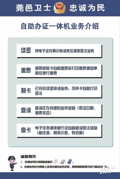 道滘公安分局表示,需要办证的市民朋友,可通过刷身份证或卡式港澳通行证进入24小时自助办证厅,具体办理业务及操作细则如下: