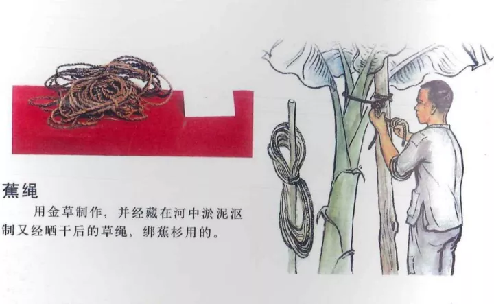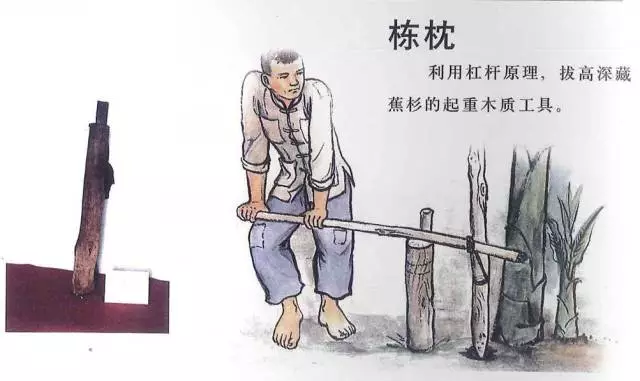 旧时的麻涌蕉农已经熟练使用杠杆原理了,在要拔除的蕉杉、蕉竹合适的距离外把木桩固定好,用小木棒绑住蕉杉、蕉竹底部后架在木桩的顶面上靠住圆细木棍,用力下压木棒的另一端,轻轻松松拔出蕉杉、蕉竹。