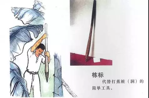 建蕉杉、蕉竹时打洞的时候,用一支长约1米下尖上粗的圆锥形木桩和一支长约30厘米的圆细木柄构成的蕉桩往地上插,一边添水,妥妥地插洞60厘米深。插杉木后有固定防风护蕉之效。