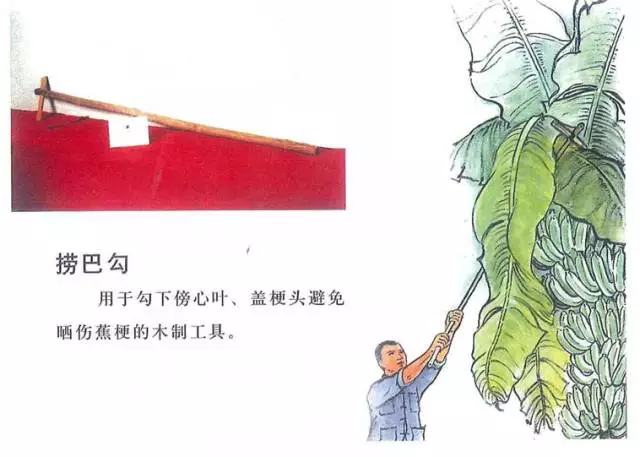 在香蕉的发育过程中,蕉梗是需要重点保护的对象,用捞巴勾把蕉叶盖在梗头上,可以有效防止蕉梗被晒伤。
