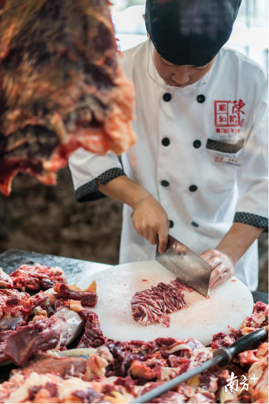 陈记顺和切肉师傅也是精挑细选的,还分多个等级。牛肉新鲜,切得不好也不好吃,因此好的切肉师傅对潮汕牛肉火锅店可谓是核心。一头900到1000斤的黄牛,出肉量仅为37%,口口珍贵,百里挑一。