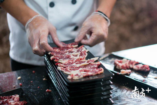 潮汕人做事非常认真,火锅店切肉师傅像日本料理片生鱼片那样,悉心处理每一片牛肉。