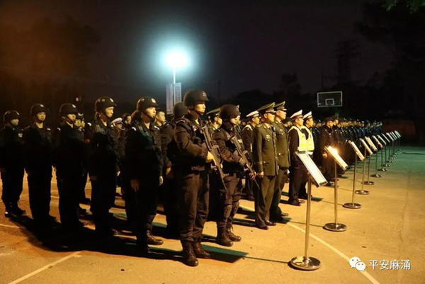 当晚19时45分,东莞市公安局水乡新城片区“统筹办”在麻涌大盛村村口球场组织上述警力举行了简短的集结动员仪式。随后,各参战单位警力按照行动方案分赴大盛村各治安复杂区域以及麻涌镇主要干道设卡查车和武装巡逻等工作。