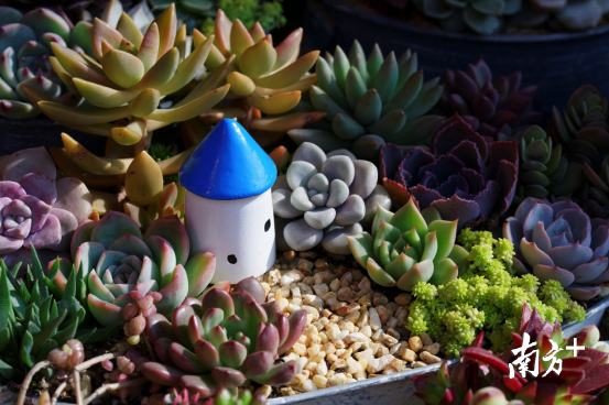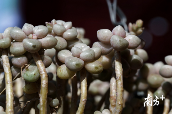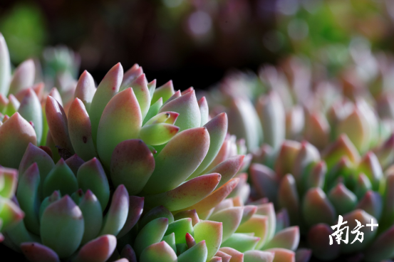 逛花市时,记者注意到多肉植物就属于清清淡淡的青、碧色系,鸭卵青、蟹壳青,还有,配上尾端的浅浅的水红色,让人想起身着青衫的书生学子。多肉店铺负责人介绍到,有一些品种的蓝色特别明显,带着有点冷漠的贵族气息,还有的品种成梦幻的蓝粉色和浅紫色,非常受消费者欢迎。