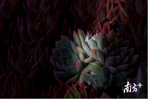 为了捕捉到阳光以一线的方式照进来的瞬间,记者也是耐心等了很久。终于,一线光落在镜头中的多肉,光照处青中泛白,粉红褪去,让人想起给微醺的李煜写下的“缥色玉柔擎”。而四周的紫褐色在暗处显得妖冶危险,衬得小家伙愈发冰清玉洁。