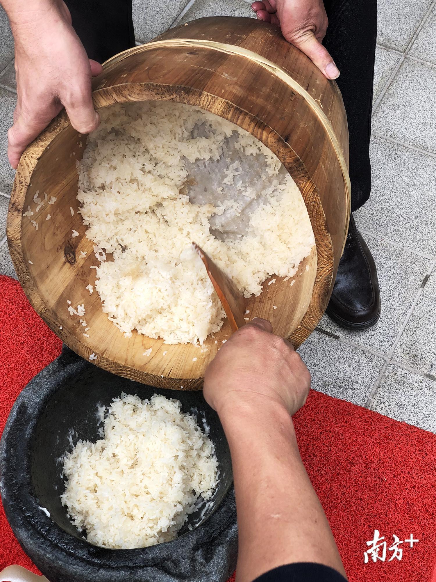 之后,把冒着热气的米饭从木甑中倒出来,放进石臼里,再用杵槌舂制。