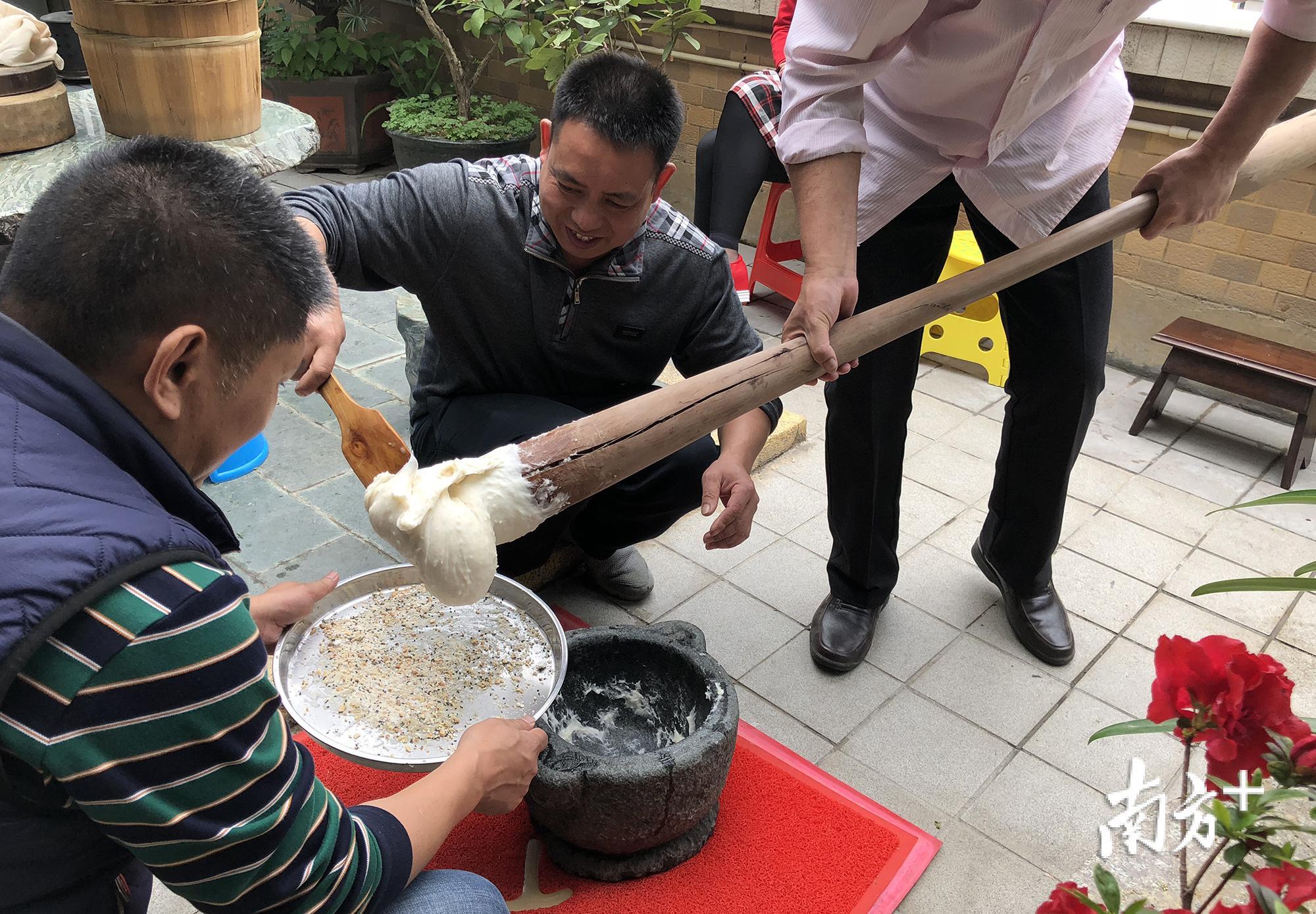 刘先生用木杵舂糯米饭,直舂到米饭粘稠如泥状,挑起不断为止,俗称“打糍”。
