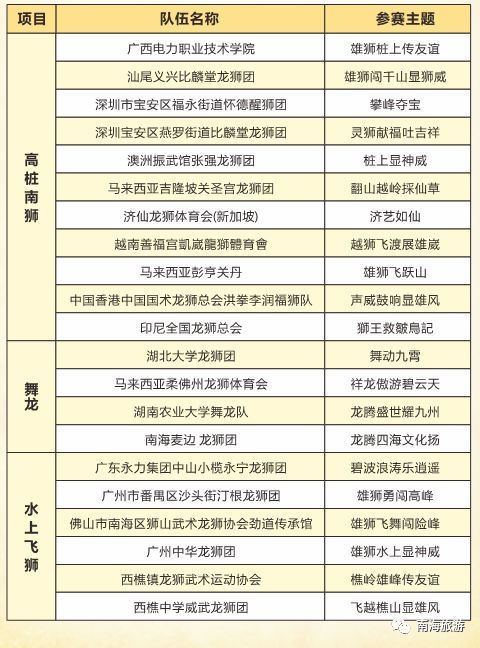 据介绍,今天有来自国内外共21支队伍将齐聚西樵山,同登“狮王擂台”,展开精彩竞技。他们分别是来自7个国家和地区的11支高桩狮队、6支水上飞狮队和4支舞龙队。