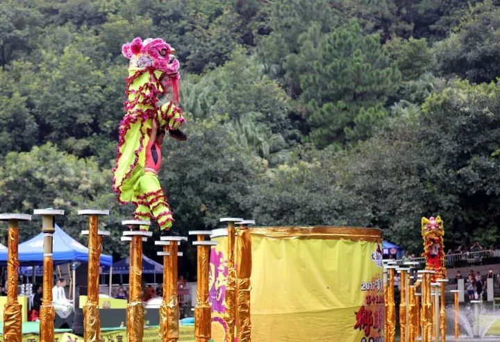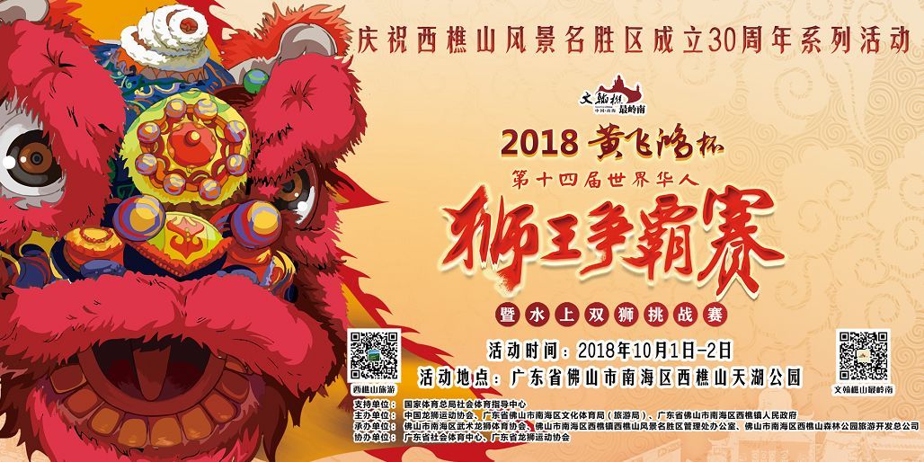 10月1日至2日,庆祝西樵山风景名胜区成立三十周年系列活动之南粤古驿道2018“黄飞鸿杯”第十四届世界华人狮王争霸赛暨水上双狮挑战赛,在南粤名山西樵山天湖公园开擂。