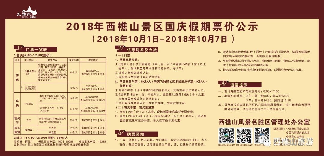 门票:10月1日至7日白天期间,游客上山门票为40元/人(原价55元),门票含南海观音和宝峰寺等山上各大景区与山下的黄飞鸿狮艺武术馆。晚上票价(17:30--23:00)为35元/人。