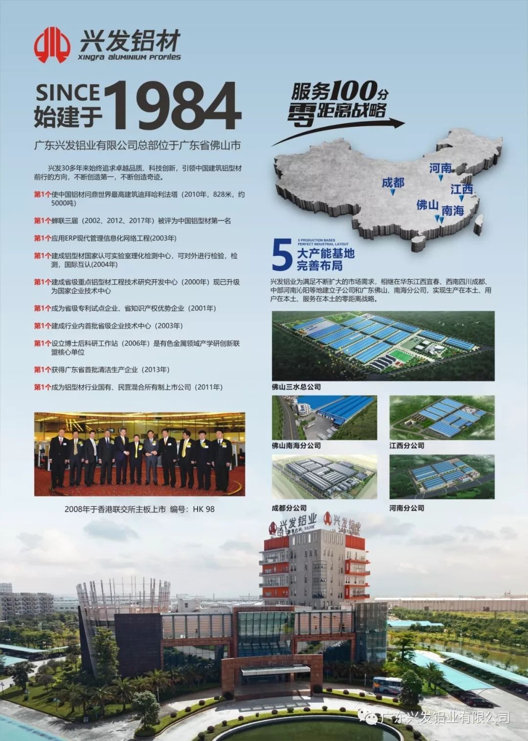 兴发铝业一直秉承“创造价值、共同发展”的核心价值观,35年打造核心技术和质量丰碑,先后被评为“国家制造业单项冠军示范企业”“国家知识产权示范企业”“国家绿色工厂”“国家标准示范基地”及“国际标准示范基地”,蝉联三届被评为“中国建筑铝型材第一名”,在2018年广东企业500强中排名第180名、在2018年广东制造业100强中排名第50名。