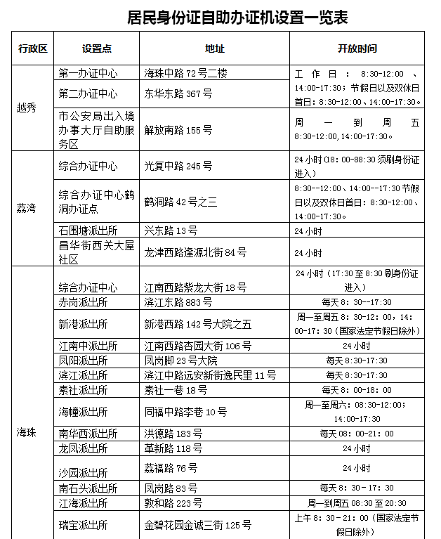 目前,广州市共有131个身份证自助办证点,具体如下。