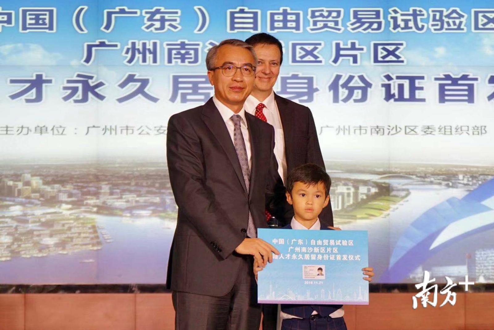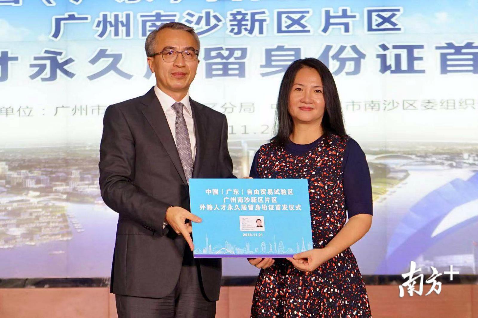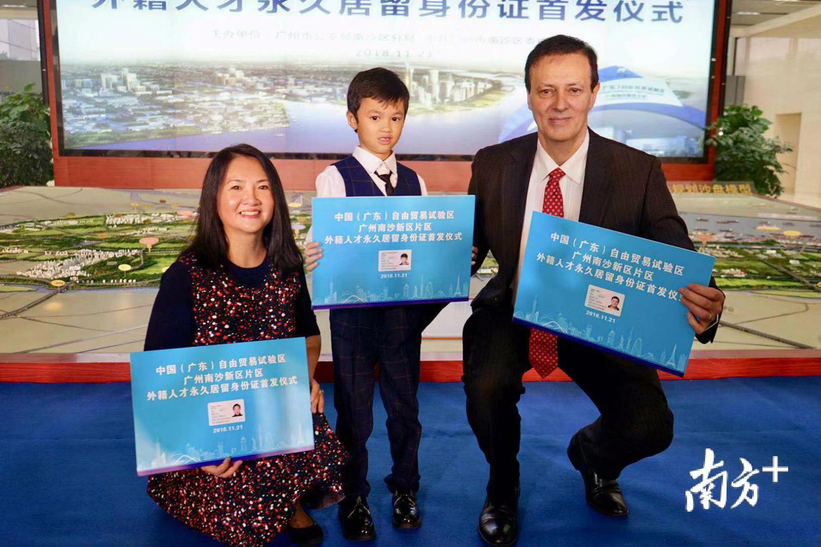 当天,广州南沙新区举行中国(广东)自由贸易试验区广州南沙新区片区外籍人才永久居留身份证首发仪式,Eames Mark与妻子熊予彬、儿子本杰明成为首批获得该片区外籍人才永久居留身份证的外国人。