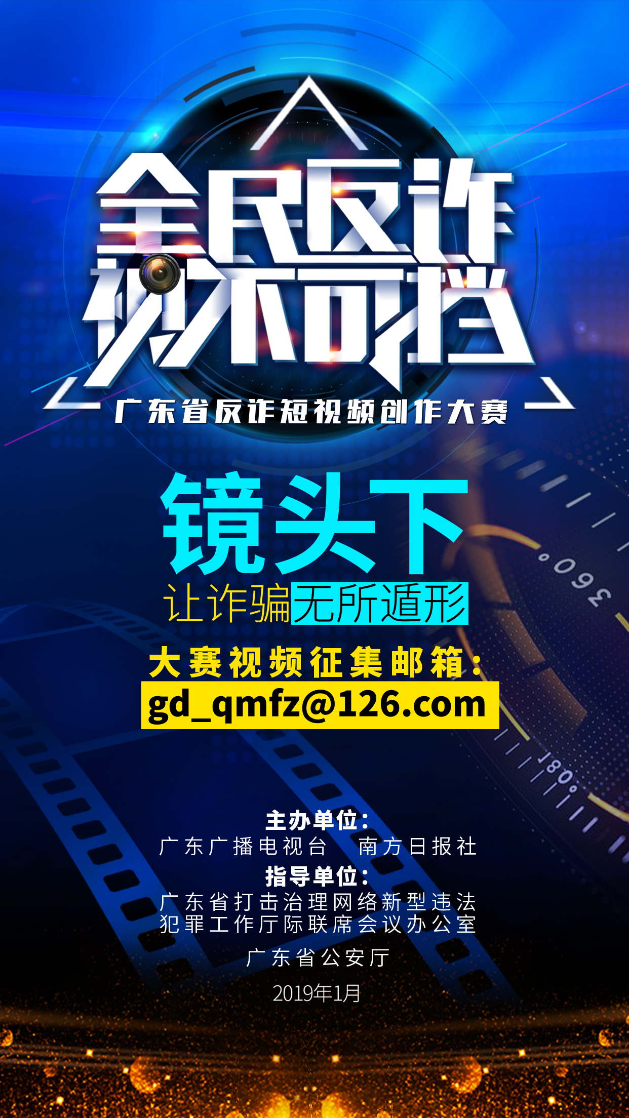 笔者从省公安厅获悉,为贯彻落实省政府构建“电诈防火墙”工程决策部署,不断提高群众防范电信网络诈骗意识,广东省打击治理电信网络新型违法犯罪工作厅际联席会议办公室与广东广播电视台、南方日报社联合主办的反诈短视频创作大赛于2019年1月8日正式启动。