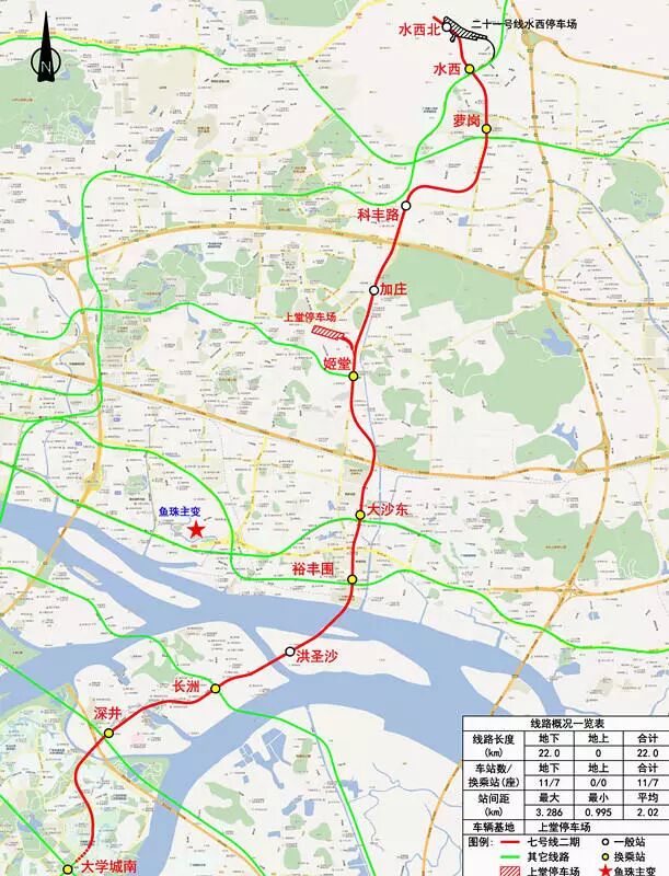 据了解,七号线二期全长约22公里,采用地下方式敷设,它起于现有一期的大学城南站,然后向北延伸至我区,设有深井、长洲、洪圣沙、裕丰围、大沙东、姬堂、加庄、科丰路、萝岗、水西、水西北等11座车站(除已运营车站外,其余站名均为工程暂定名)。