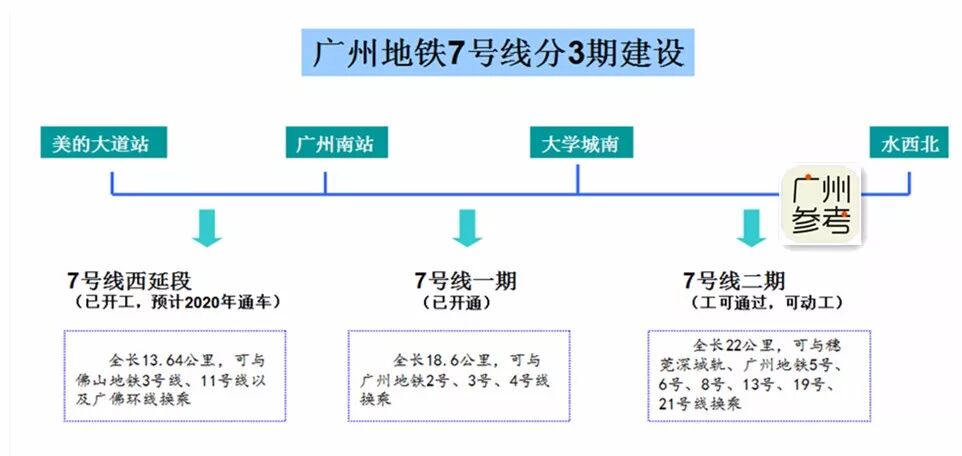 以上只是7号线的一期线路,7号线二期,还会连接黄埔,更会与佛山地铁相接,直达顺德。