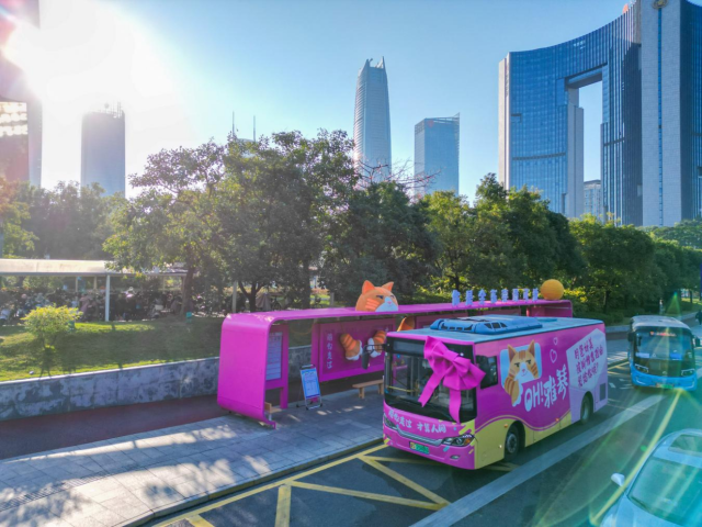 近日,元美东路一辆粉色的巴士吸引了全城目光——粉色巴士车身上的“OH雅琴”格外醒目,正面系着粉色的大蝴蝶结,车尾飘着一串彩色的气球;从侧面看,一只胖胖的猫咪从窗户探出头来,车身的另一面则是一朵红玫瑰,更提神的是,巴士的四面都是情话!
