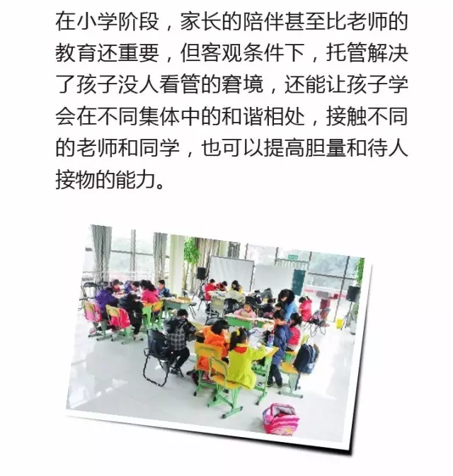 学校日常的安全管理措施,已经能够高标准地保证学生们的在校安全。跟社会上的托管班相比,孩子们不用出校门,不用过马路,不用去陌生的地方和陌生的孩子一起活动。在熟悉的校园和熟悉的同学们在一起,显然安全系数更高。
