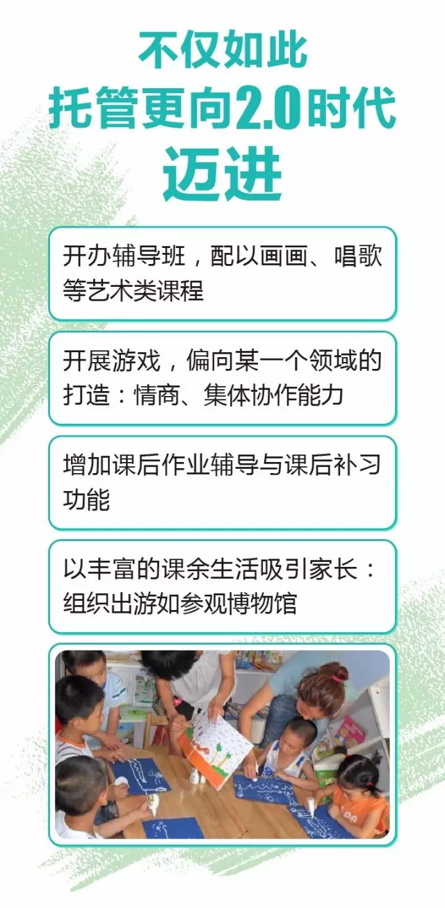 “安心托管班”也就是看管做作业。该托管班也为学校和学生提供两种选择,一是每生每天7元(政府补贴2元,家长支付5元),由一名人员负责。一种是每生每天10元,由2名人员负责(政府补贴2元,家长支付8元)。安心托管班的老师除了看管写作业,还会让孩子们参与活动。