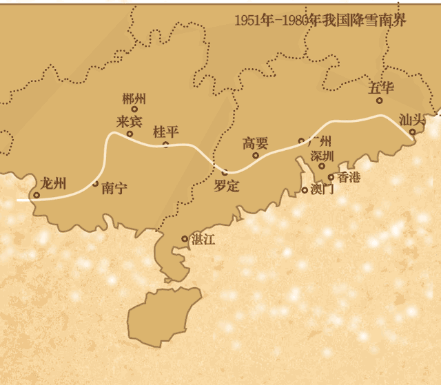 广州下雪算不算稀奇?并不算,有完整气象记录以来,也就是1951年以来的这60余年资料显示,福建、广东和广西的许多地方曾经下过雪。在这段时间里,我国出现了两条最南雪线,其中一条为1951年~1980年,另一条是1981年~2015年。第一条雪线贯穿广西龙州、南宁、来宾、桂平,来到广东罗定、高要。而第二条雪线,广东部分北至广宁、佛冈、河源一线。